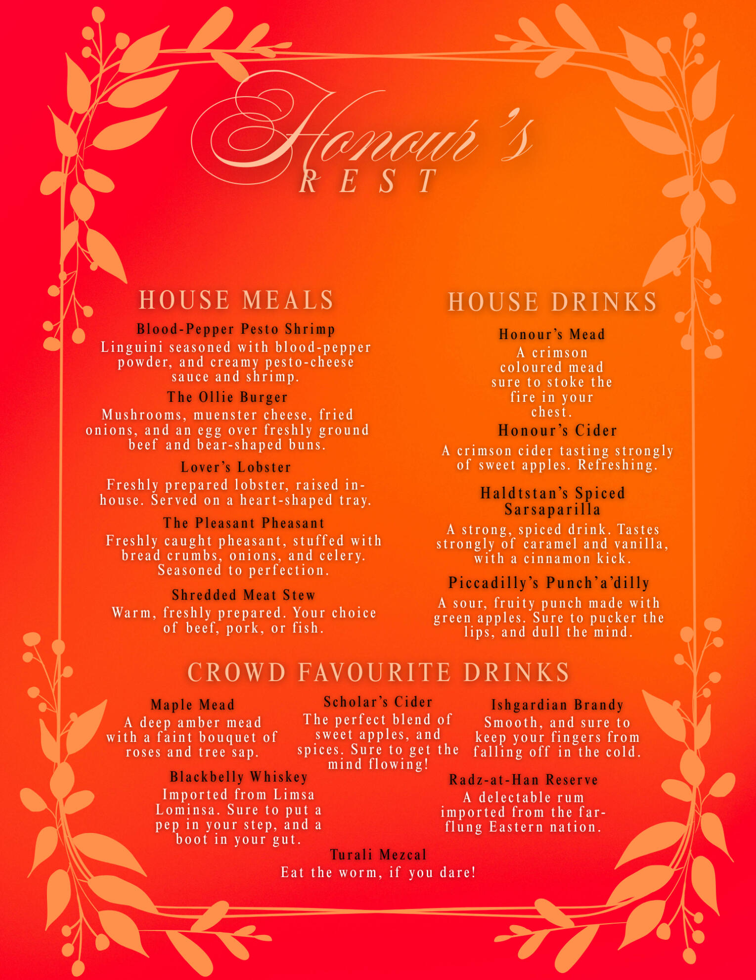 Honour's Rest Tavern serves as a home for all those seeking a reprieve from the horror, and terrors of war. Come and enjoy a drink or two in good company, and lively camaradarie.
